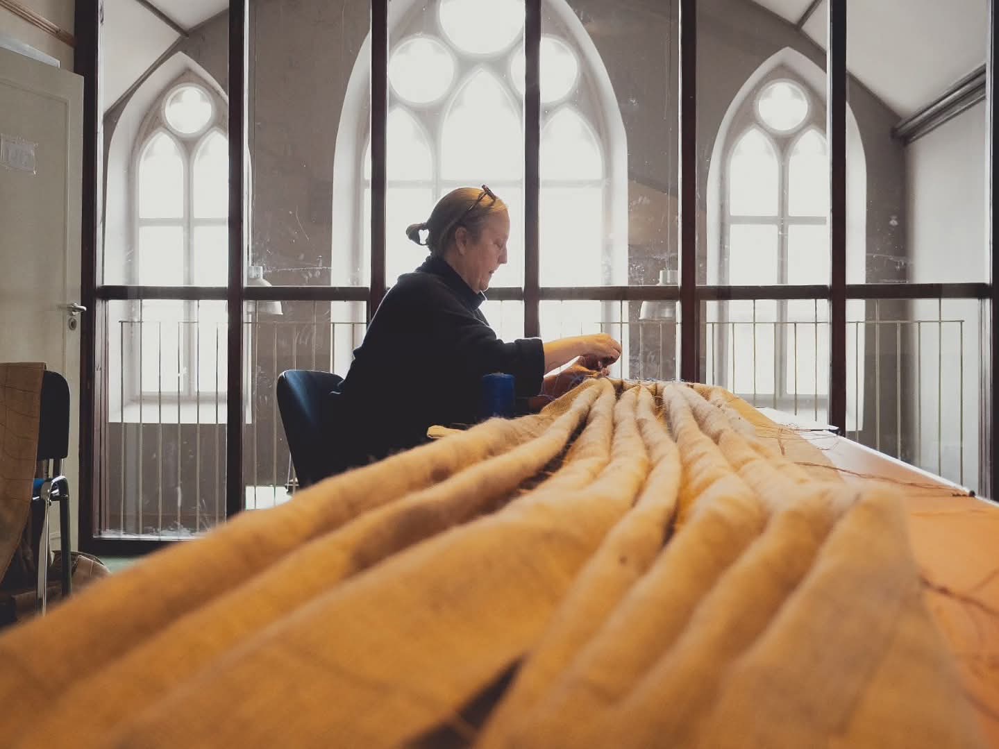 Annie's practice incorporates interiors and architecture to explore our relationship to space through materials. By working with this very sculptural and traditional technique she connects people to place and heritage through haptic experience. The installation at Ruth Smith Gallery will use the honeycomb technique associated with the rural English smocked frock, whilst the hessian it will be made from nods to its traditional use covering buildings to regulate the drying times of lime render. Through this installation, which acts as a type of inside/outside upholstery, she pushes a traditional building material and sewing technique to an extreme to play with ideas of decoration and functionality.